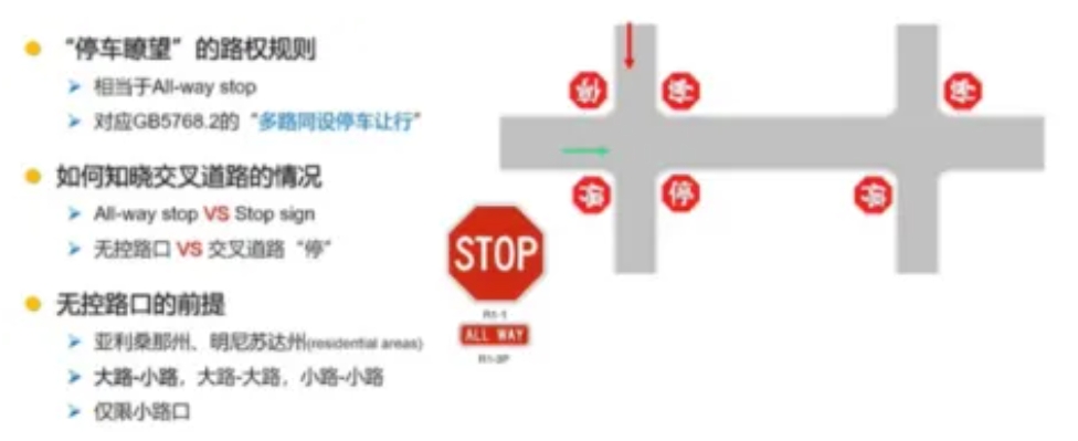 要求所有来车都“在进入路口前停车瞭望”,相当于是GB5768.2的“多路同设停车让行”,即通常所说的“四向停”控制。其路权规则是:在路口完全停车;先到先行;若同时到达,相邻方向是让右、相向行驶是左转让行。